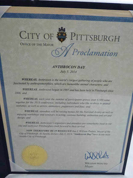 NOW THEREFORE IT BE RESOLVED that I, WIlliam Peduto, Mayor of the City of Pittsburgh, do hereby declare July 5, 2014 as “Anthrocon Day” here in our most livable city of Pittsburgh.