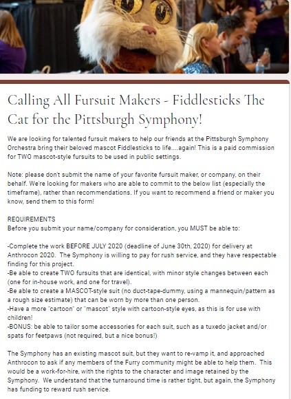 Pittsburgh Symphony Orchestra is Looking For Fursuit Makers 10/22/2019 Ahmar Wolf This one is legit folks check out the link Share this: Click to share on Pinterest (Opens in new window) Pinterest Click to share on Facebook (Opens in new window) Facebook Click to share on X (Opens in new window) X Click to share on Tumblr (Opens in new window) Tumblr More Click to share on LinkedIn (Opens in new window) LinkedIn Click to print (Opens in new window) Print Click to email a link to a friend (Opens in new window) Email Like Loading...