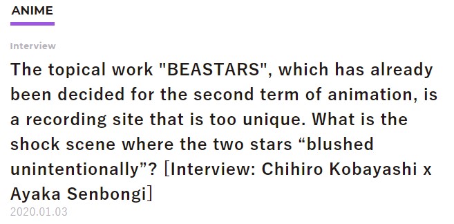 Beastars Renewed for 2nd Season Posted on 01/11/2020 by Ahmar Wolf According to Entertainment Station a Japanese Media News Site Share this: Click to share on Pinterest (Opens in new window) Pinterest Click to share on Facebook (Opens in new window) Facebook Click to share on X (Opens in new window) X Click to share on Tumblr (Opens in new window) Tumblr More Click to share on LinkedIn (Opens in new window) LinkedIn Click to print (Opens in new window) Print Click to email a link to a friend (Opens in new window) Email Like Loading... Published by Ahmar Wolf I am interested in just about everything View all posts by Ahmar Wolf