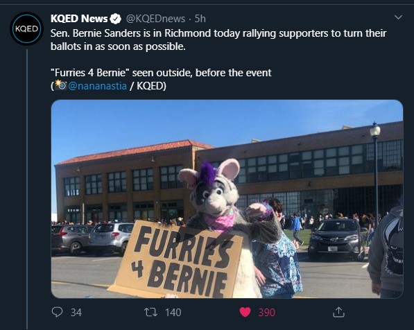 Furries Taking Sides in This Election Year Posted on 02/18/2020 by Ahmar Wolf From KQED’s own Twitter feed. Share this: Click to share on Pinterest (Opens in new window) Pinterest Click to share on Facebook (Opens in new window) Facebook Click to share on X (Opens in new window) X Click to share on Tumblr (Opens in new window) Tumblr More Click to share on LinkedIn (Opens in new window) LinkedIn Click to print (Opens in new window) Print Click to email a link to a friend (Opens in new window) Email Like Loading... Published by Ahmar Wolf I am interested in just about everything View all posts by Ahmar Wolf