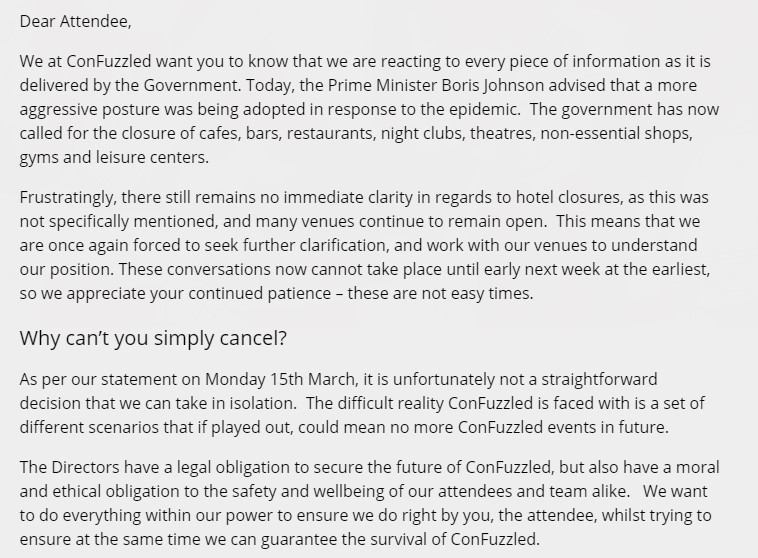 Confuzzled released a statement on March 20 is a clear example of what cons are currently facing. A combo of government regs and their own finances.