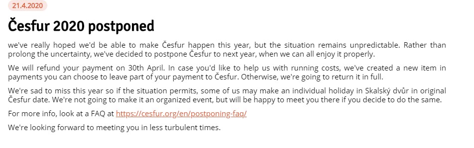 COVID-19 Report: Lakeside Furs, Furizon 04/23/2020 Ahmar Wolf Lakeside Furs which takes place in Salzburg, Austria has canceled there 2020 convention Original Post on Twitter Furizon which takes place in Italy has released the following statement CESFUR which takes place in the Czech Republic postponed there 2020 convention Share this: Click to share on Pinterest (Opens in new window) Pinterest Click to share on Facebook (Opens in new window) Facebook Click to share on X (Opens in new window) X Click to share on Tumblr (Opens in new window) Tumblr More Click to share on LinkedIn (Opens in new window) LinkedIn Click to print (Opens in new window) Print Click to email a link to a friend (Opens in new window) Email Like Loading...