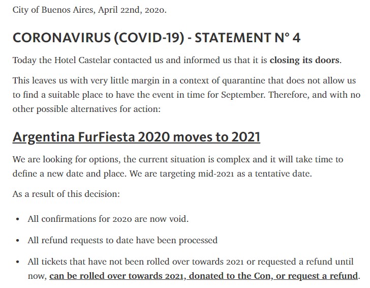 Argentina Fur Fiesta cancels their 2020 convention. On their Telegram group they made the following statement.