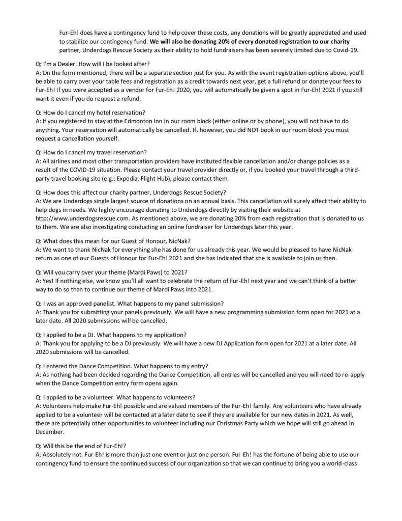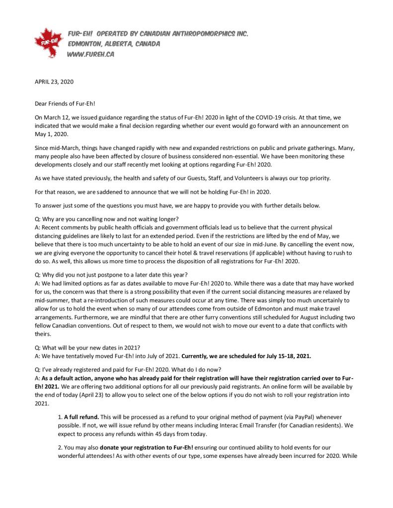 Fur-Eh! Edmonton, Alberta, Canada Cancels 2020 convention. In a statement posted on their Twitter they stated the following: