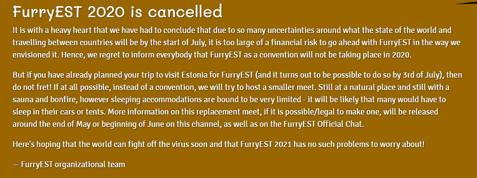 FurryEST which is a furry camping events that takes place in July in Estonia cancelled this years gathering.