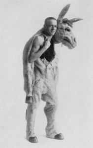 Yes animal impersonation was a whole sub-specialty in vaudeville! Other animal impersonators we have profiled on Travalanche have included Alfred Latell (best known as Bonzo the Bull Pup) and Will Ferry the Human Frog. This was an era when fairy tales were frequently presented on stage for audiences of children and their families, so it’s not as odd as it may seem at first blush. Woodward’s best known specialty was probably mules, but his repertoire also included parrots, ostriches, frogs, storks, owls, alligators, a teddy bear, and the G.O.P. Elephant!