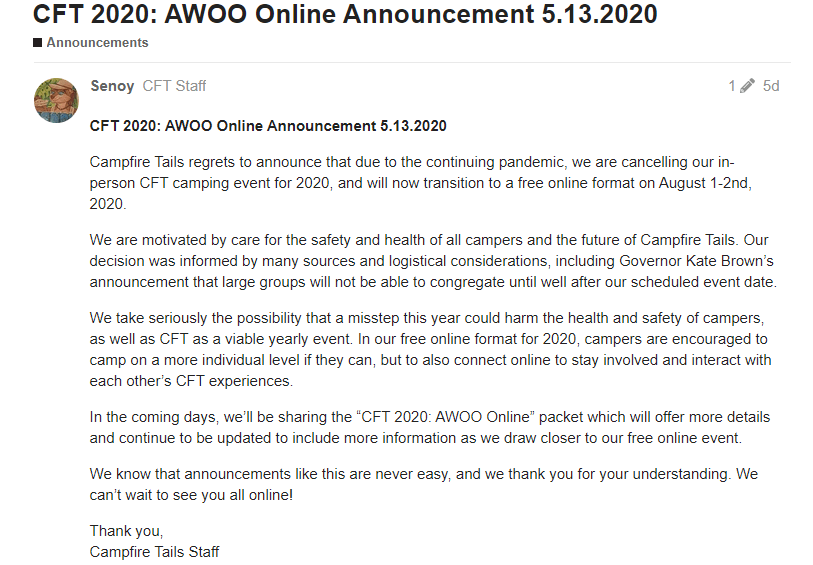 Campfire Tails which was suppose to take place on August 1 & 2 is doing something rather unique they are turning there con into an online event. Original post here