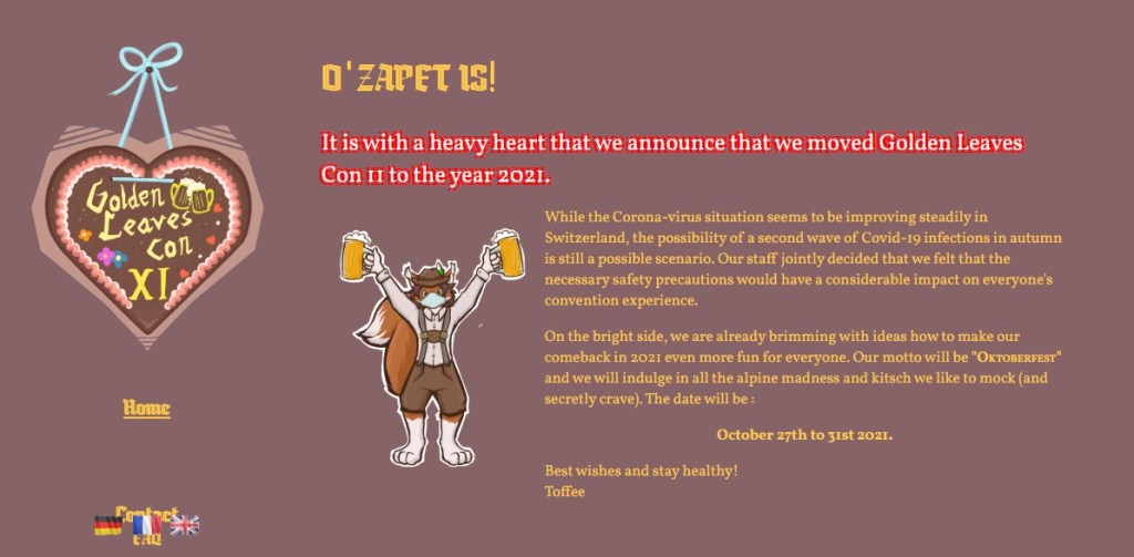 Golden Leaves Fur Con, which takes place in October in Switzerland, has cancelled its 2020 convention. The new date is October 27-31 2021.