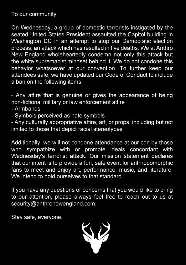 Anthro New England Issues Statement about DC Riot 01/09/2021 Ahmar Wolf I support them in their effort to end hate Share this: Click to share on Pinterest (Opens in new window) Pinterest Click to share on Facebook (Opens in new window) Facebook Click to share on X (Opens in new window) X Click to share on Tumblr (Opens in new window) Tumblr More Click to share on LinkedIn (Opens in new window) LinkedIn Click to print (Opens in new window) Print Click to email a link to a friend (Opens in new window) Email Like Loading...