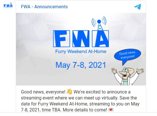Furry Weekend At-Home Set for May 7 & 8 03/20/2021 Ahmar Wolf More details can be found on their official site Share this: Click to share on Pinterest (Opens in new window) Pinterest Click to share on Facebook (Opens in new window) Facebook Click to share on X (Opens in new window) X Click to share on Tumblr (Opens in new window) Tumblr More Click to share on LinkedIn (Opens in new window) LinkedIn Click to print (Opens in new window) Print Click to email a link to a friend (Opens in new window) Email Like Loading...