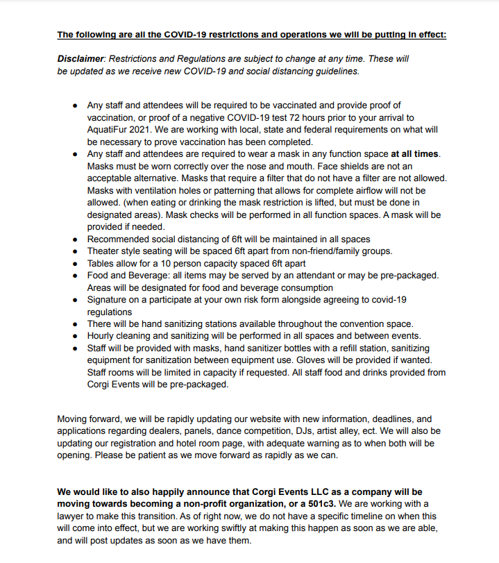 Fur Con News: Aquatifur is Coming Back Posted on 05/22/2021 by Ahmar Wolf Official Announcement Share this: Click to share on Pinterest (Opens in new window) Pinterest Click to share on Facebook (Opens in new window) Facebook Click to share on X (Opens in new window) X Click to share on Tumblr (Opens in new window) Tumblr More Click to share on LinkedIn (Opens in new window) LinkedIn Click to print (Opens in new window) Print Click to email a link to a friend (Opens in new window) Email Like Loading... Published by Ahmar Wolf I am interested in just about everything View all posts by Ahmar Wolf
