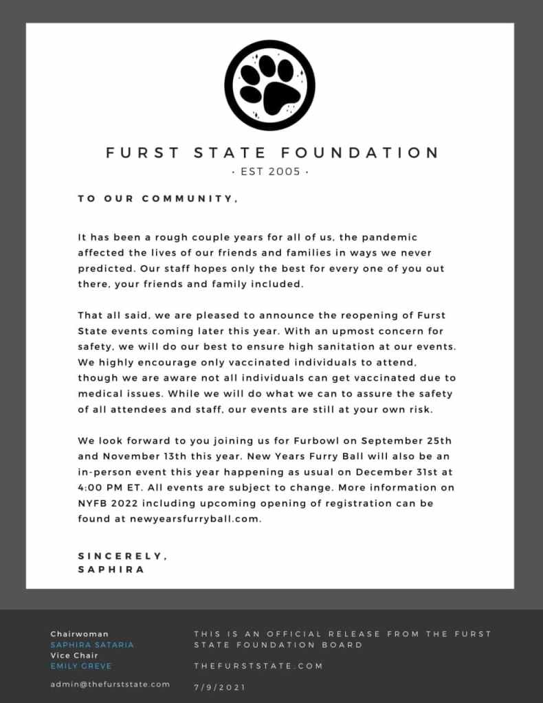 News from Furst State Foundation based in Delaware. Their New Years Furry Ball will make a return in person this year Dec 31st 4pm ET