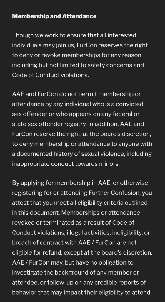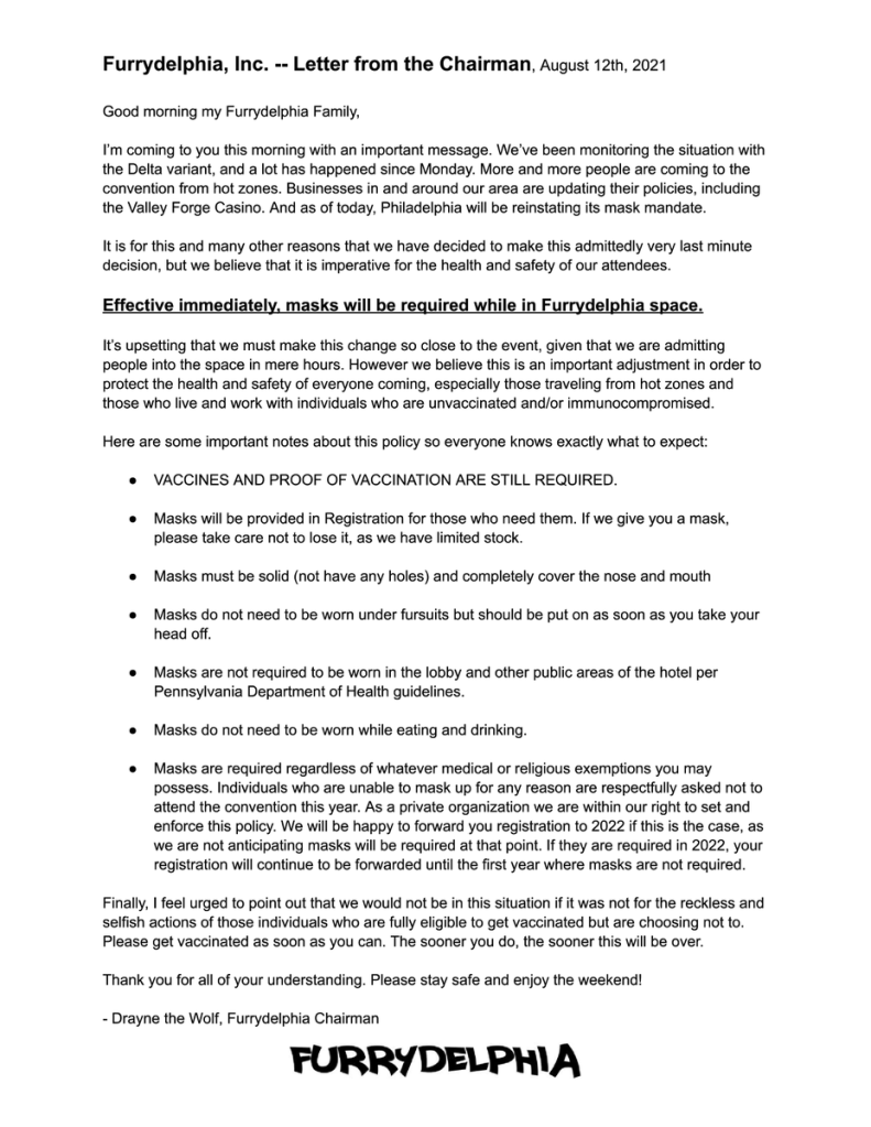 Fur Con News: Further Confusion, Furrydelphia 08/13/2021 Ahmar Wolf In the wake of the troubles at the most recent Megaplex both Further Confusion and Furrydelphia changed their Code of Conduct. Which I suggest you read, if planning on attending. Furrydelphia Share this: Click to share on Pinterest (Opens in new window) Pinterest Click to share on Facebook (Opens in new window) Facebook Click to share on X (Opens in new window) X Click to share on Tumblr (Opens in new window) Tumblr More Click to share on LinkedIn (Opens in new window) LinkedIn Click to print (Opens in new window) Print Click to email a link to a friend (Opens in new window) Email Like Loading...