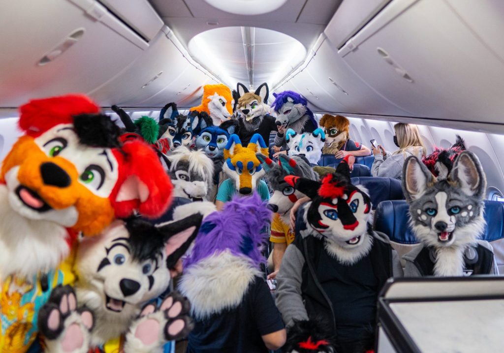 A Southwest Airlines flight from Reno to Denver was taken over by a group of animal costume-wearing passengers who are collectively known as furries. The flight attendants and pilots onboard Southwest flight WN1212 took the situation in their stride, even stopping to pose with the furry community while other passengers – known as normies – looked on.