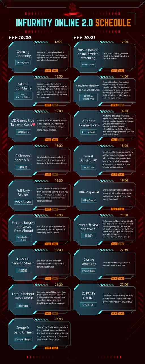 📢 Infurnity Online 2.0 live stream schedule has officially been released! 📢 We have all sorts of content packed into our schedule. It’s sure to bring everyone a wonderful time this weekend! We’ll see you online on Oct 30-31st, 2021! Check the HD ver. at our website