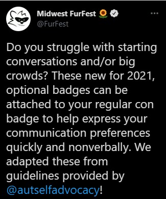 MFF to Offer Color Communication Badges 11/07/2021 Ahmar Wolf Share this: Click to share on Pinterest (Opens in new window) Pinterest Click to share on Facebook (Opens in new window) Facebook Click to share on X (Opens in new window) X Click to share on Tumblr (Opens in new window) Tumblr More Click to share on LinkedIn (Opens in new window) LinkedIn Click to print (Opens in new window) Print Click to email a link to a friend (Opens in new window) Email Like Loading...