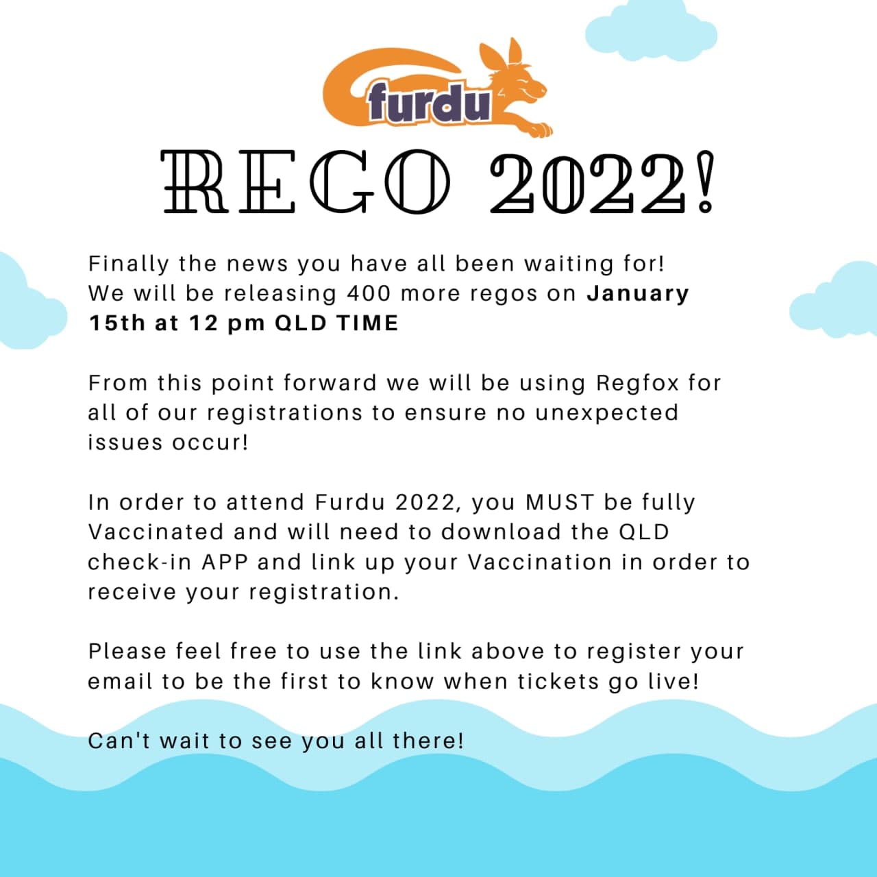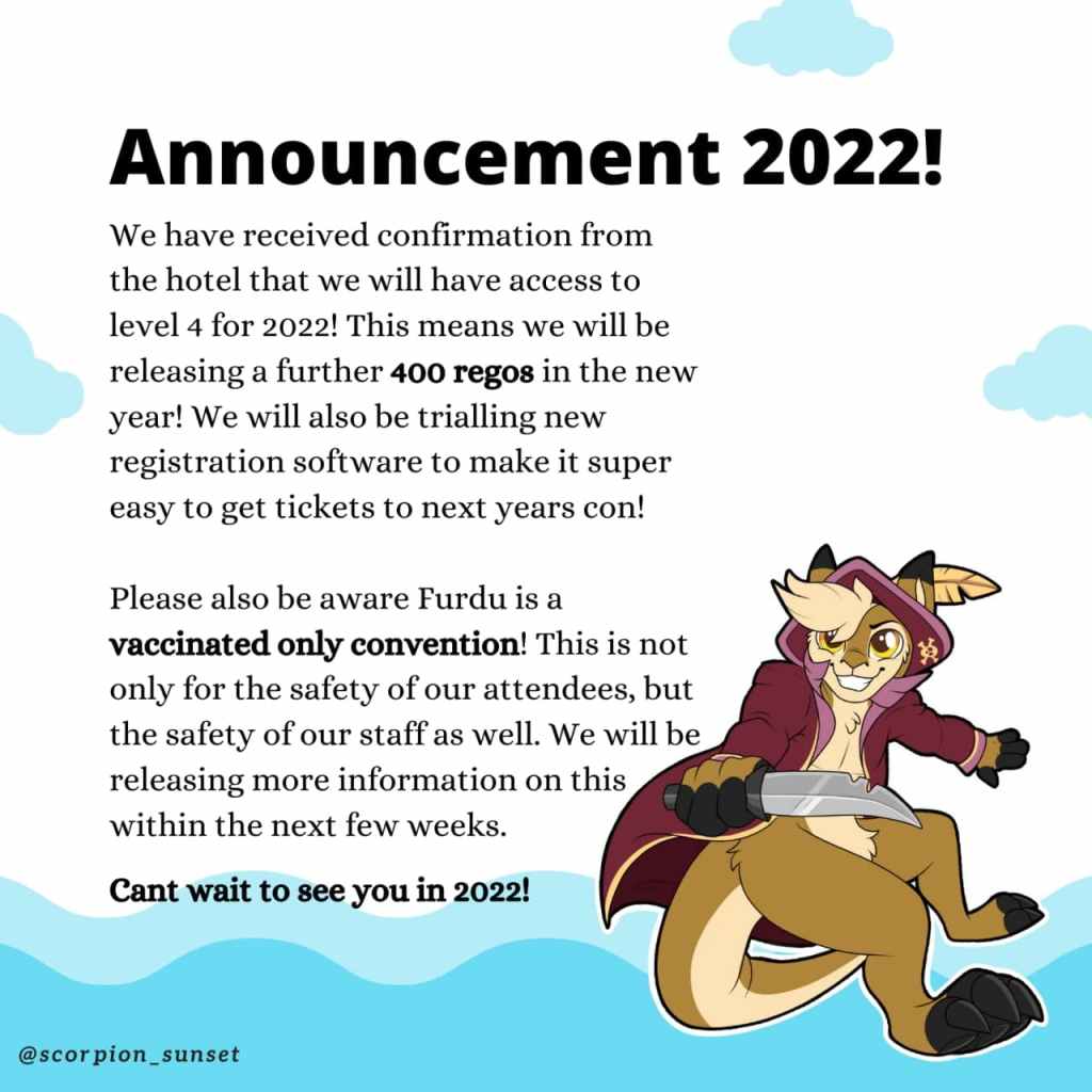 FurDu (Australia) Increases Capacity for 2022 Con 12/30/2021 Ahmar Wolf Share this: Click to share on Pinterest (Opens in new window) Pinterest Click to share on Facebook (Opens in new window) Facebook Click to share on X (Opens in new window) X Click to share on Tumblr (Opens in new window) Tumblr More Click to share on LinkedIn (Opens in new window) LinkedIn Click to print (Opens in new window) Print Click to email a link to a friend (Opens in new window) Email Like Loading...