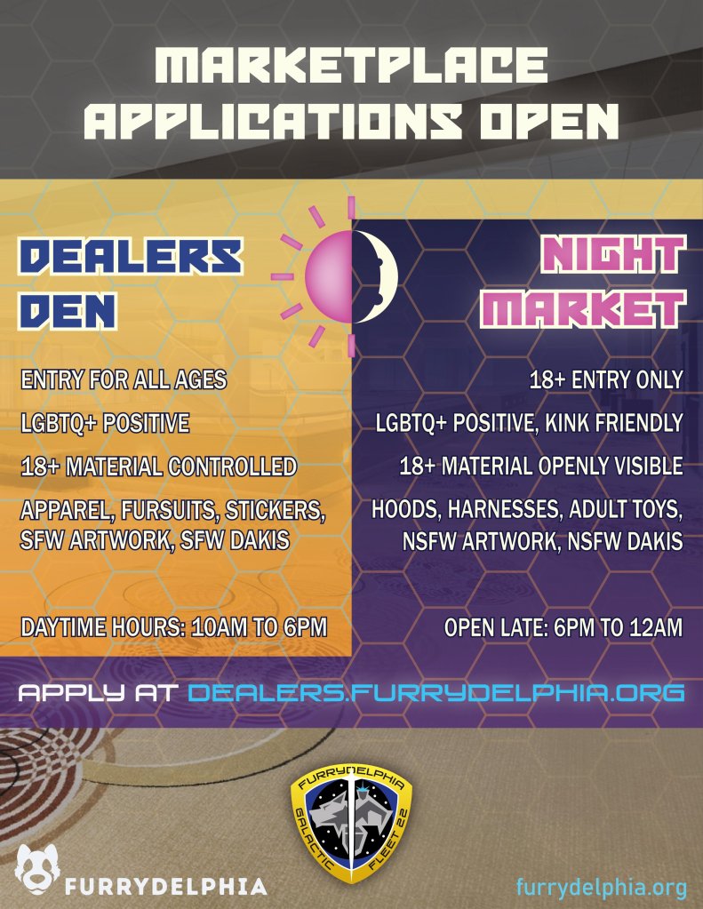 Applications for Dealers Den & Night Market at #Furrydelphia2022 are open now!! Apply today for either our usual SFW daytime Dealers Den, or our first ever after-dark NSFW Night Market at http://dealers.furrydelphia.org