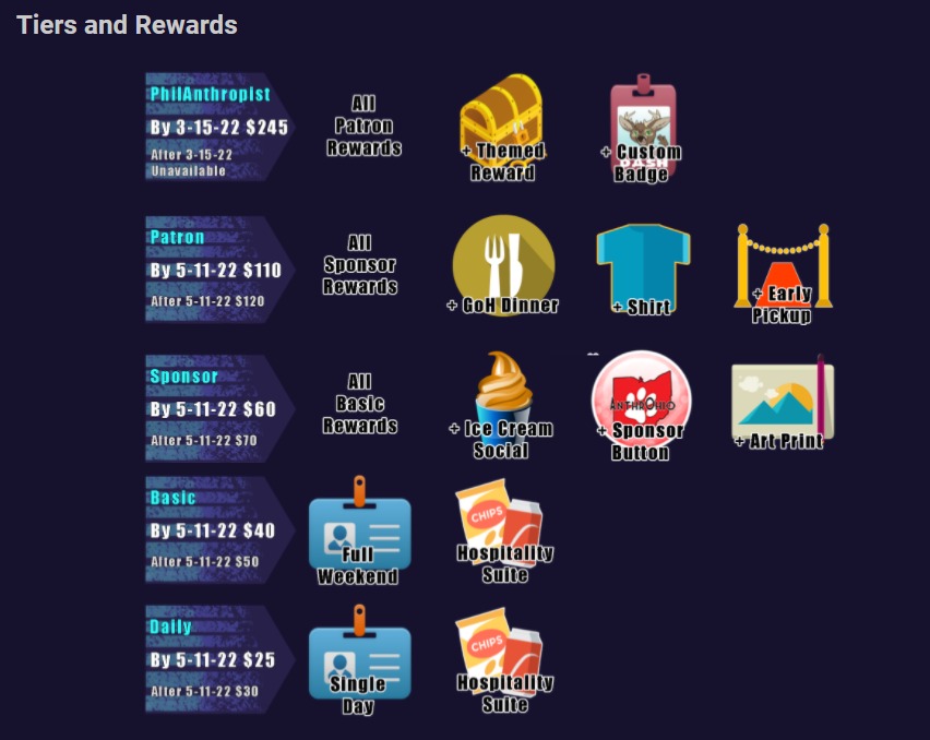 Attendee Badge: ALL Attendees receive a Badge that they are to wear to access all of AnthrOhio’s Convention Function Space. Basic, Sponsors, Patrons and PhilAnthropists Badges are for the Full Weekend, and Daily Badges are for one Specific Day.