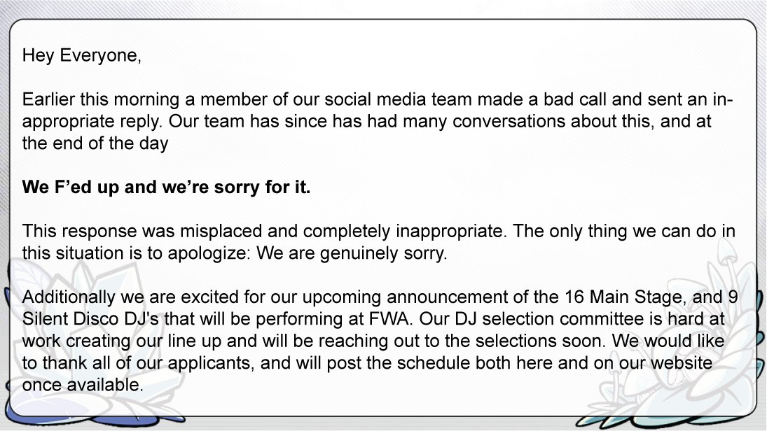 FWA Controversy: Paid Non Furry Acts 03/13/2022 Ahmar Wolf In short this is what happened Con hired a gold record award winning non furry DJ musician that allegedly promotes NFT’s taking a spot away from someone who could actually use the exposure and promotion. FWA’s Response We will have to see what happens coming forward Share this: Click to share on Pinterest (Opens in new window) Pinterest Click to share on Facebook (Opens in new window) Facebook Click to share on X (Opens in new window) X Click to share on Tumblr (Opens in new window) Tumblr More Click to share on LinkedIn (Opens in new window) LinkedIn Click to print (Opens in new window) Print Click to email a link to a friend (Opens in new window) Email Like Loading...
