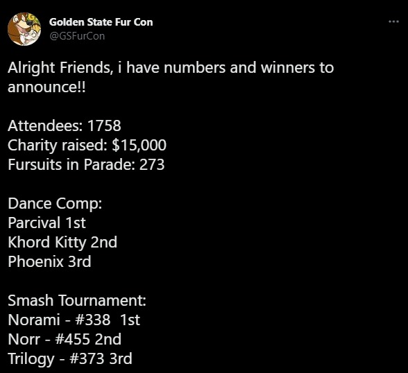 Golden State Fur Con 2022 Numbers 04/12/2022 Ahmar Wolf Share this: Click to share on Pinterest (Opens in new window) Pinterest Click to share on Facebook (Opens in new window) Facebook Click to share on X (Opens in new window) X Click to share on Tumblr (Opens in new window) Tumblr More Click to share on LinkedIn (Opens in new window) LinkedIn Click to print (Opens in new window) Print Click to email a link to a friend (Opens in new window) Email Like Loading...
