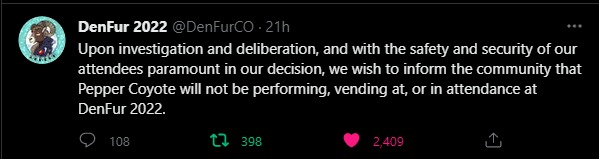With that Tweet it’s Official, a fixture at more than 1 fur con gets banned, for what I am assuming in bad behaviour. We will have to see if Pepper Coyote gets banned from other cons.