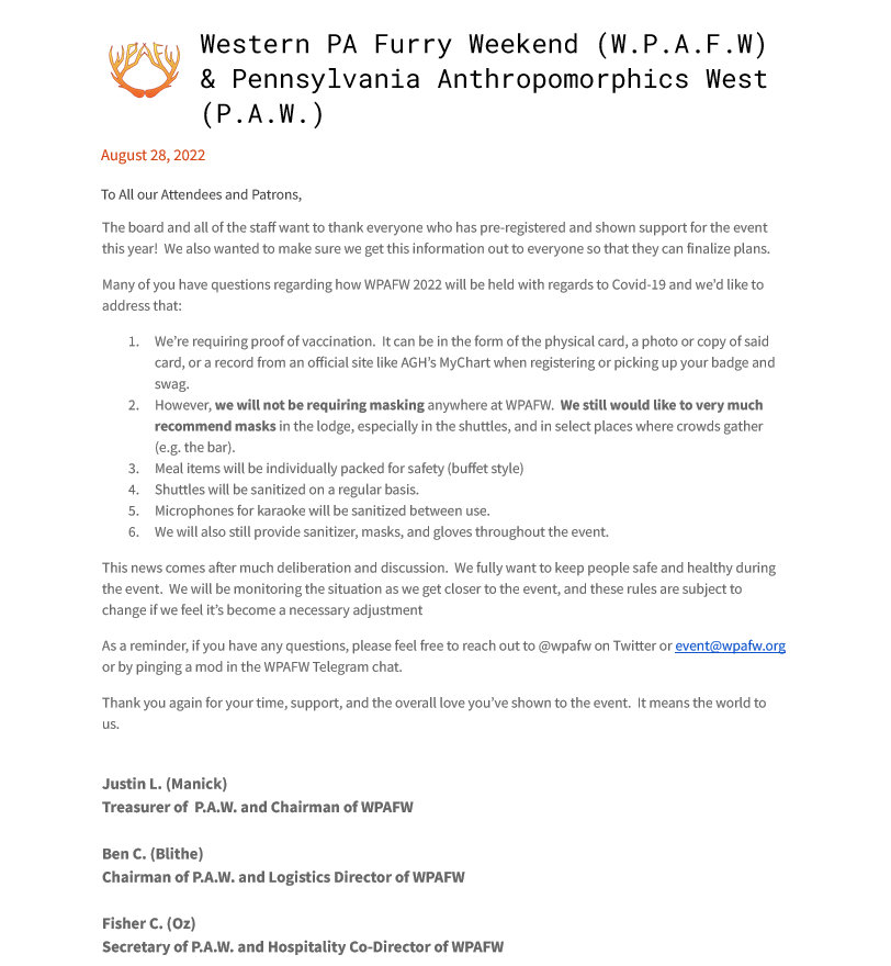 WPAFW COVID Policy Posted on 08/30/2022 by Ahmar Wolf Hi-ho folks! This Sunday we’re making a bit more of a formal announcement, as our Covid Policy has been updated and cleared for 2022. Please see the attached, and have a good rest of your weekend! Share this: Click to share on Pinterest (Opens in new window) Pinterest Click to share on Facebook (Opens in new window) Facebook Click to share on X (Opens in new window) X Click to share on Tumblr (Opens in new window) Tumblr More Click to share on LinkedIn (Opens in new window) LinkedIn Click to print (Opens in new window) Print Click to email a link to a friend (Opens in new window) Email Like Loading... Published by Ahmar Wolf I am interested in just about everything View all posts by Ahmar Wolf
