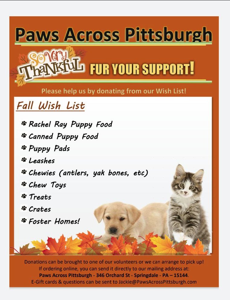 WPAFW Charity & Suggested Donations 10/07/2022 Ahmar Wolf So our charity of the year (Paws Across Pittsburgh) has put together a list of donatable items! Feel free to bring these along to WPAFW if you would like to donate them! Share this: Click to share on Pinterest (Opens in new window) Pinterest Click to share on Facebook (Opens in new window) Facebook Click to share on X (Opens in new window) X Click to share on Tumblr (Opens in new window) Tumblr More Click to share on LinkedIn (Opens in new window) LinkedIn Click to print (Opens in new window) Print Click to email a link to a friend (Opens in new window) Email Like Loading...