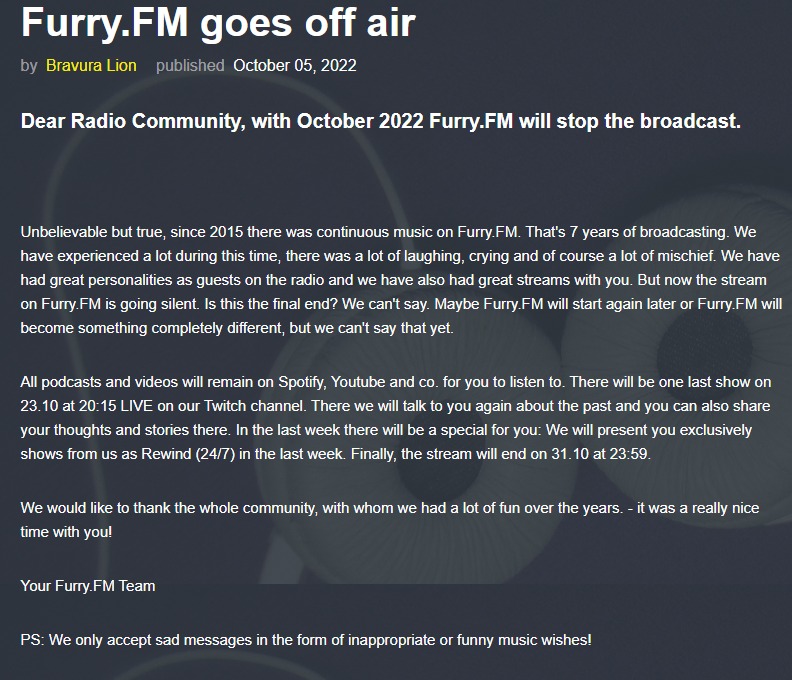 Furry.FM Goes Silent 10/07/2022 Ahmar Wolf Share this: Click to share on Pinterest (Opens in new window) Pinterest Click to share on Facebook (Opens in new window) Facebook Click to share on X (Opens in new window) X Click to share on Tumblr (Opens in new window) Tumblr More Click to share on LinkedIn (Opens in new window) LinkedIn Click to print (Opens in new window) Print Click to email a link to a friend (Opens in new window) Email Like Loading...