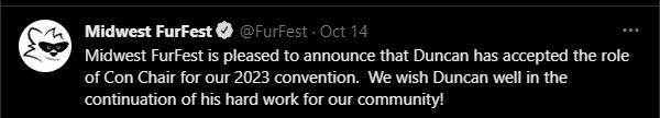 To be clear: being chosen to chair Midwest FurFest again is an honor and a challenge I gladly accept. We have an amazing team of smart, capable volunteers who work hard every single day of the year to prepare for the convention.