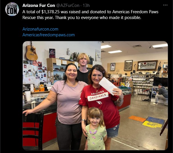 Arizona Fur Con Charity Numbers 10/18/2022 Ahmar Wolf Share this: Click to share on Pinterest (Opens in new window) Pinterest Click to share on Facebook (Opens in new window) Facebook Click to share on X (Opens in new window) X Click to share on Tumblr (Opens in new window) Tumblr More Click to share on LinkedIn (Opens in new window) LinkedIn Click to print (Opens in new window) Print Click to email a link to a friend (Opens in new window) Email Like Loading...