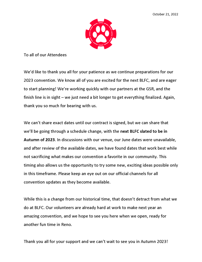BLFC Issues A Possible Change 10/22/2022 Ahmar Wolf Share this: Click to share on Pinterest (Opens in new window) Pinterest Click to share on Facebook (Opens in new window) Facebook Click to share on X (Opens in new window) X Click to share on Tumblr (Opens in new window) Tumblr More Click to share on LinkedIn (Opens in new window) LinkedIn Click to print (Opens in new window) Print Click to email a link to a friend (Opens in new window) Email Like Loading...