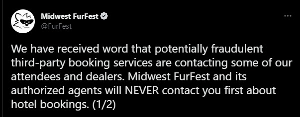 MFF Issues A Fraud Warning 10/22/2022 Ahmar Wolf If the booking link takes you anywhere other than a http:// furfest. org or http:// passkey. com domain, we urge you to use extreme caution before providing personal information or credit card information. (2/2) Share this: Click to share on Pinterest (Opens in new window) Pinterest Click to share on Facebook (Opens in new window) Facebook Click to share on X (Opens in new window) X Click to share on Tumblr (Opens in new window) Tumblr More Click to share on LinkedIn (Opens in new window) LinkedIn Click to print (Opens in new window) Print Click to email a link to a friend (Opens in new window) Email Like Loading...
