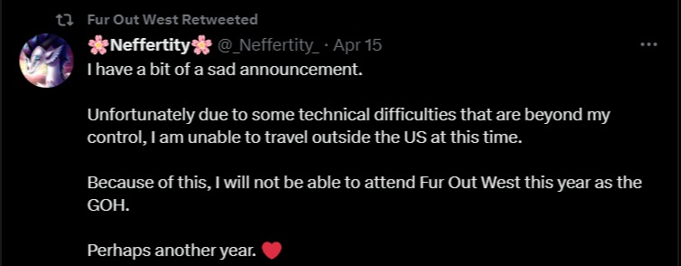 Fur Out West (Australia) GoH Pulls Out 04/20/2023 Ahmar Wolf GoH or not FOW6: Candy Land. 21st – 23rd July 2023. Atrium Hotel, Mandurah, Western Australia. Share this: Click to share on Pinterest (Opens in new window) Pinterest Click to share on Facebook (Opens in new window) Facebook Click to share on X (Opens in new window) X Click to share on Tumblr (Opens in new window) Tumblr More Click to share on LinkedIn (Opens in new window) LinkedIn Click to print (Opens in new window) Print Click to email a link to a friend (Opens in new window) Email Like Loading...