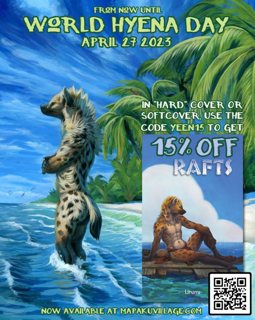 Are you… KEEN on YEENS? In honour of the upcoming World Hyena Day (April 27), I’m offering a coupon code for 15% off a physical copy of my book ‘Rafts’! Survival! Romance! Gnolls! Love! Feels! Language difficulties! Gay stuff! Please retweet! 🙂 https://mapakuvillage.square.site/?cc=YEEN15
