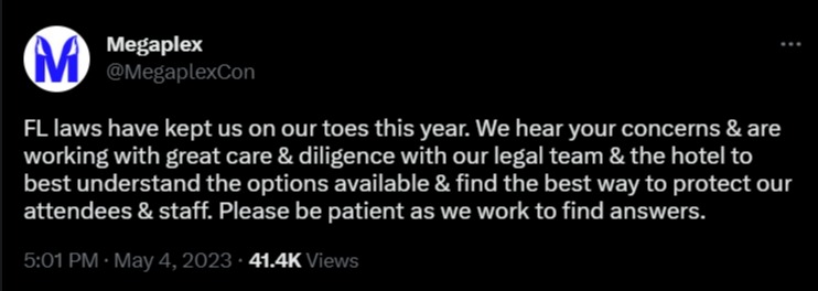 Megaplex Update 05/10/2023 Ahmar Wolf When you have a Florida Man running a state, you just roll your eyes to see what crazy law they pass next. But when your a convention… Share this: Click to share on Pinterest (Opens in new window) Pinterest Click to share on Facebook (Opens in new window) Facebook Click to share on X (Opens in new window) X Click to share on Tumblr (Opens in new window) Tumblr More Click to share on LinkedIn (Opens in new window) LinkedIn Click to print (Opens in new window) Print Click to email a link to a friend (Opens in new window) Email Like Loading...