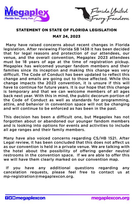 I start with that release to assure everyone this was not Megaplex’s doing it was the State of Florida, Repubicans and “Meatball” DeSantas that wanna be dictator governor. Who has just declared war on furries and we being family friendly. I for one am PISSED, Those idiots will soon find out who really runs things… us furries. We are everywhere and we are mainly IT. You can use whatever search tool you like in every case where it came down to Furry VS. Some idiot Furries Always Win.