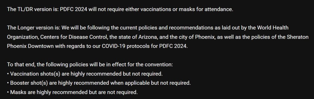 Painted Desert Fur Con 2024 COVID Policy 09/27/2023 Ahmar Wolf Share this: Click to share on Pinterest (Opens in new window) Pinterest Click to share on Facebook (Opens in new window) Facebook Click to share on X (Opens in new window) X Click to share on Tumblr (Opens in new window) Tumblr More Click to share on LinkedIn (Opens in new window) LinkedIn Click to print (Opens in new window) Print Click to email a link to a friend (Opens in new window) Email Like Loading...