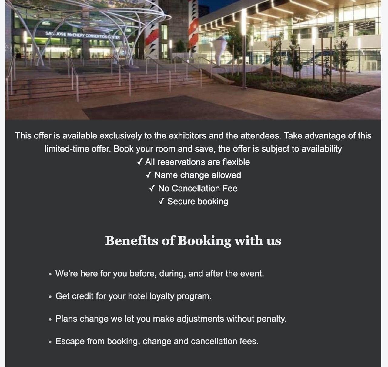 Email Warning Posted on 10/01/2023 by Ahmar Wolf The following is 100% Fake This was sent out by a scammer, and you can see how convincing it can be. Make sure you deal directly with legit sources when trying to get a room for a con. Share this: Click to share on Pinterest (Opens in new window) Pinterest Click to share on Facebook (Opens in new window) Facebook Click to share on X (Opens in new window) X Click to share on Tumblr (Opens in new window) Tumblr More Click to share on LinkedIn (Opens in new window) LinkedIn Click to print (Opens in new window) Print Click to email a link to a friend (Opens in new window) Email Like Loading... Published by Ahmar Wolf I am interested in just about everything View all posts by Ahmar Wolf