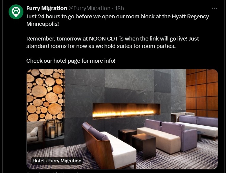 Furry Migration 2024 Hotel Block Open 05/04/2024 Ahmar Wolf Hotel Reg is open as well Share this: Click to share on Pinterest (Opens in new window) Pinterest Click to share on Facebook (Opens in new window) Facebook Click to share on X (Opens in new window) X Click to share on Tumblr (Opens in new window) Tumblr More Click to share on LinkedIn (Opens in new window) LinkedIn Click to print (Opens in new window) Print Click to email a link to a friend (Opens in new window) Email Like Loading...