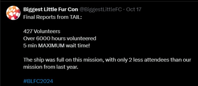 Biggest Little Fur Con #Numbers Posted on 10/23/2024 by Ahmar Wolf Attendance was 4122 Share this: Click to share on Pinterest (Opens in new window) Pinterest Click to share on Facebook (Opens in new window) Facebook Click to share on X (Opens in new window) X Click to share on Tumblr (Opens in new window) Tumblr More Click to share on LinkedIn (Opens in new window) LinkedIn Click to print (Opens in new window) Print Click to email a link to a friend (Opens in new window) Email Like Loading... Published by Ahmar Wolf I am interested in just about everything View all posts by Ahmar Wolf