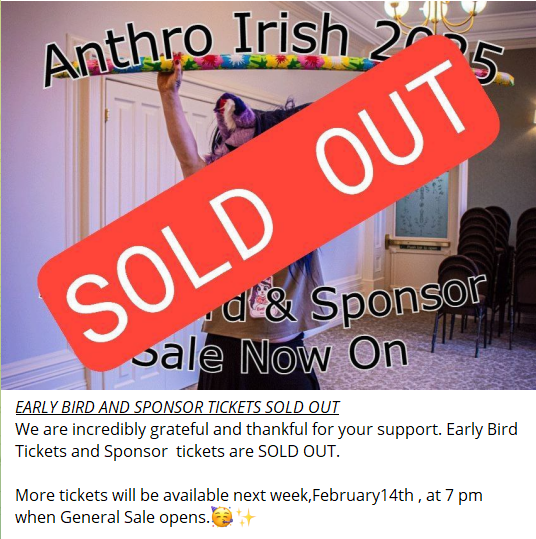 Anthro Irish Sells Out in 38 Minutes 02/08/2025 Ahmar Wolf They went on sale 38 minutes earlier. This looks as if the furries discovered a local con Share this: Click to share on Pinterest (Opens in new window) Pinterest Click to share on Facebook (Opens in new window) Facebook Click to share on X (Opens in new window) X Click to share on Tumblr (Opens in new window) Tumblr More Click to share on LinkedIn (Opens in new window) LinkedIn Click to print (Opens in new window) Print Click to email a link to a friend (Opens in new window) Email Like Loading...
