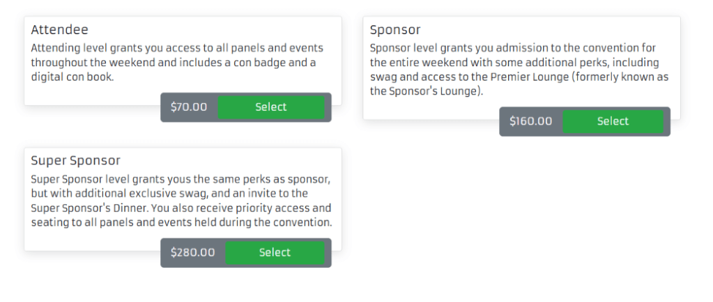OMG all the excitement of a big con, but in a little con package. Never having an issue and actually being able to speak with board members excellent. Con Swag AMAZING, Con Suite okay drinks, snack foods that was about it. The hotel did set up a stand selling food, cheap and good. Panels amazing.