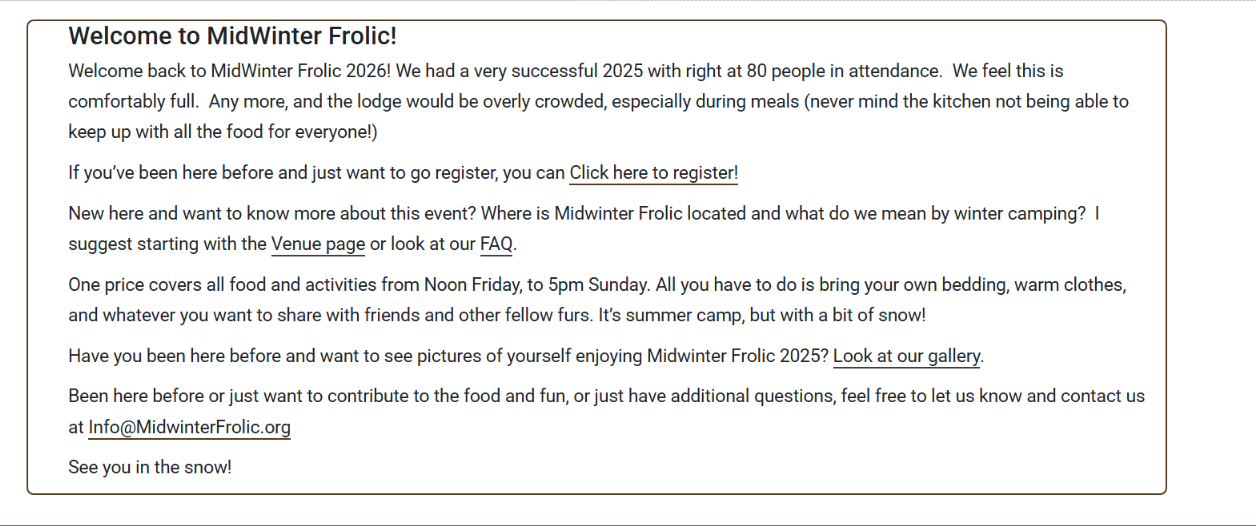 MidWinter Frolic 01/08/2026 Ahmar WolfLeave a comment Whitewater State Park, Altura, MN 2 prices $99 and $230 For more Info https://www.midwinterfrolic.org/ Share this: Click to share on Pinterest (Opens in new window) Pinterest Click to share on Facebook (Opens in new window) Facebook Click to share on X (Opens in new window) X Click to share on Tumblr (Opens in new window) Tumblr More Click to share on LinkedIn (Opens in new window) LinkedIn Click to print (Opens in new window) Print Click to email a link to a friend (Opens in new window) Email Like Loading...