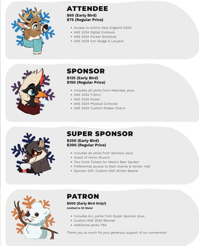 Now that we have a year in our new home under our belts, we’re looking to make things bigger and better, to improve on our weak points, and overall, to bring the New England furry community the best possible hometown con experience we possibly can. We’re so excited to work with our 2024 Guests of Honor: Wolf, Woozie, and Declan. And we’re ready to try new things. If you have suggestions, ideas, thoughts – fire away; we’re open to feedback. Leave a comment here, or reach out to us on social media!