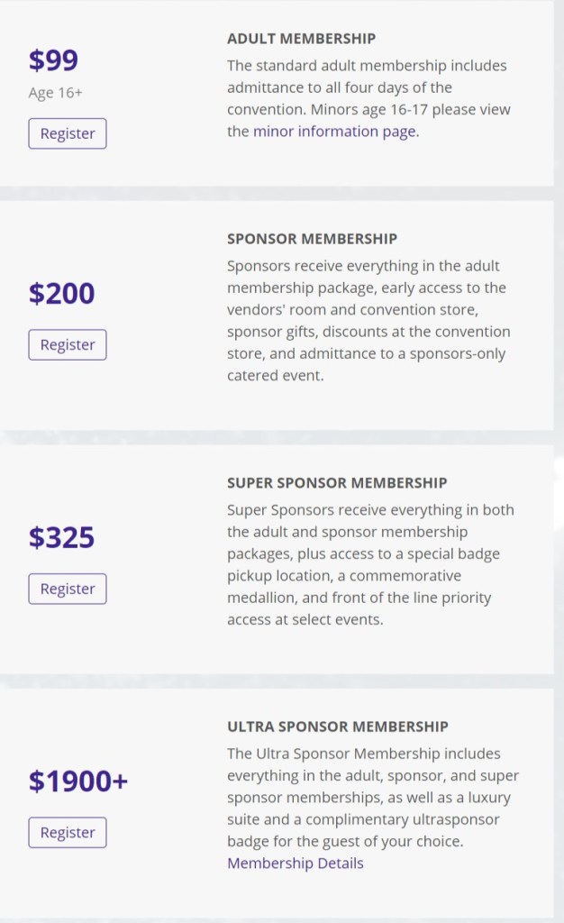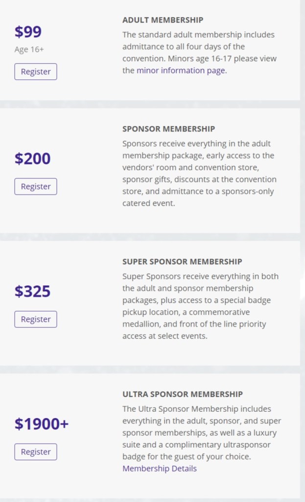 Sponsors receive everything in the adult membership package, early access to the vendors’ room and convention store, sponsor gifts, discounts at the convention store, and admittance to a sponsors-only catered event.