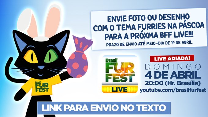 Lembramos que todas as comunicações da BFF serão feitas unicamente na nossa página https://www.brasilfurfest.com.br, no nosso canal de anúncios do Telegram (t.me/bffnoticias), em nossas mídias sociais e nas BFF Lives mensalmente no YouTube.