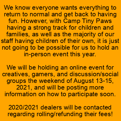 Due to unforeseen circumstances, we will not be able to hold any future in-person events. Our hotel has been sold and permanently closed as of last week and prices at other venues have skyrocketed due to the pandemic. This means we had to make the tough decision to close down Camp Tiny Paws for good. We are incredibly sorry to have to share this heartbreaking news and had been looking forward to seeing you in 2022.