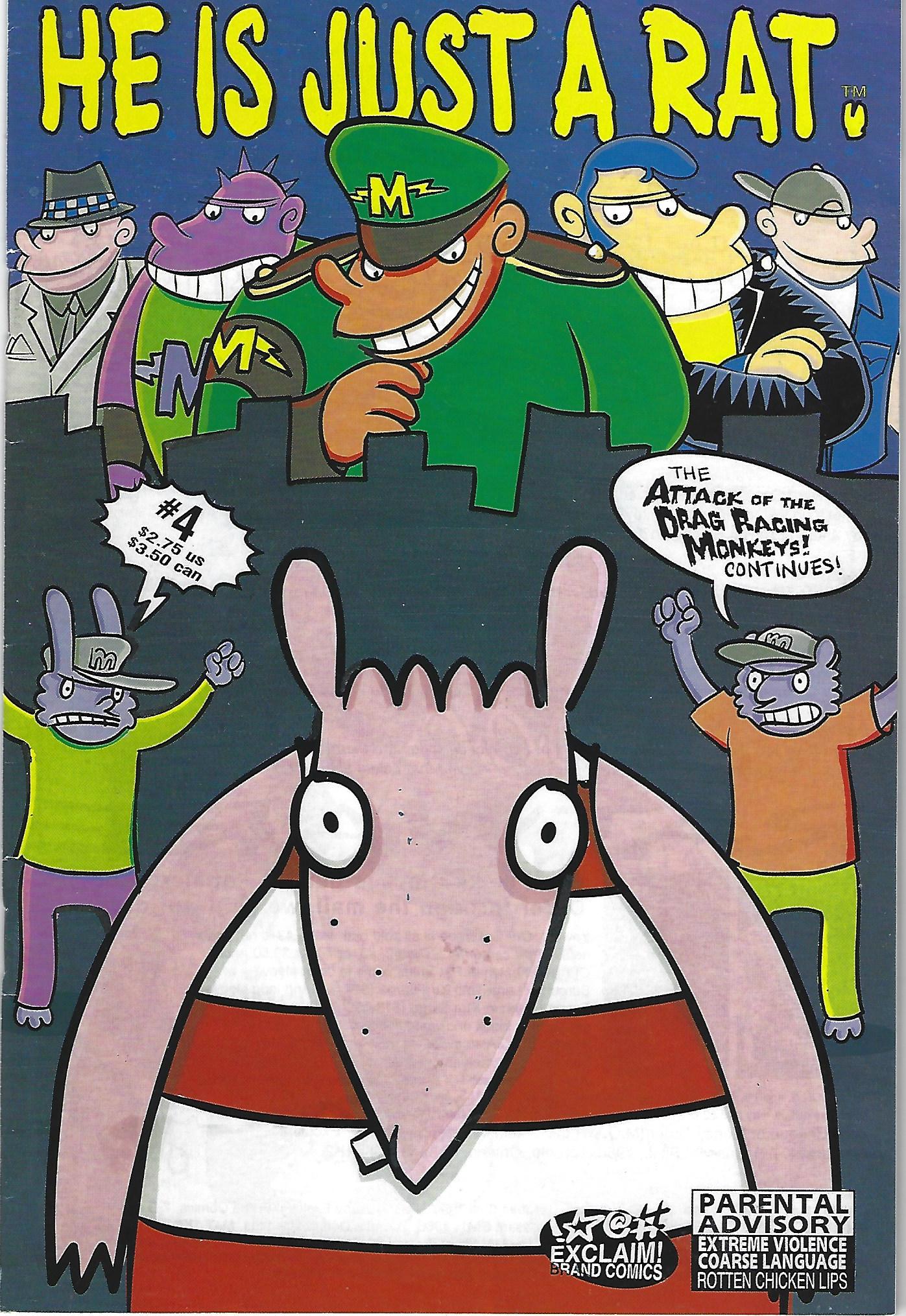 The story is subtitled The Attack of the Drag Racing Monkeys and they are the bad guys. Rat or Rat Boy as he is sometimes called is captured by these Drag Racing Moneys who are determined to conquer the world. We start out by seeing him captured after a dumb mistake makes he is free after knocking his 2 guards out cold. After looking for food Rat finds himself in the lab and accidentally shrinks down then uses his small size to make his escape. Later he finds himself at their HQ which is located in a bar and after making a rather lethal compound winds up killing nearly all of them.