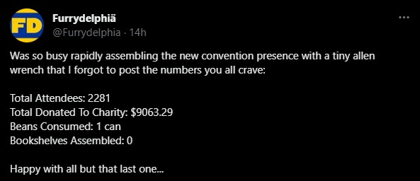 So you might be wondering how does this compare to the last Furrydelphia which was held in 2019. It saw 1332 attendees. Beating it’s own total by 949, making it the 8th con to smash previous attendance totals
